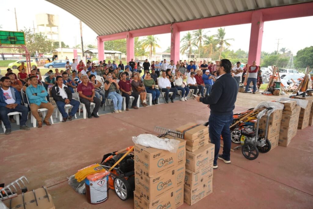 Durante el evento se entregaron herramientas y materiales de limpieza, equipo de trabajo y artículos de apoyo comunitario, entre los que destacan bieldos, podadoras, palas, machetes, escobas, botas de trabajo, impermeables y otros insumos, como parte de una política pública orientada a fortalecer la capacidad operativa de los ejidos.