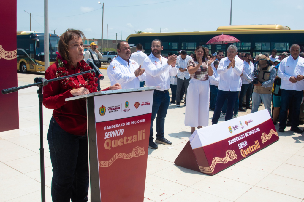 Coatzacoalcos, Ver., 26 de marzo de 2026.- La gobernadora de Veracruz, Rocío Nahle García, y el presidente municipal, Pedro Miguel Rosaldo García, dieron el banderazo de salida a 60 unidades híbridas Quetzalli, marcando el inicio de una nueva etapa de modernización en la movilidad urbana del municipio.