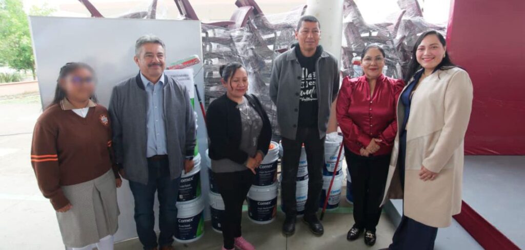 La entrega incluyó mil 245 cubetas de pintura, 950 de impermeabilizante, 3 mil 948 sillas para mesa trapezoidal, mil 974 mesas trapezoidales, 340 pizarrones y 61 pantallas, destinados a 62 primarias, 10 secundarias federales y 16 telesecundarias.