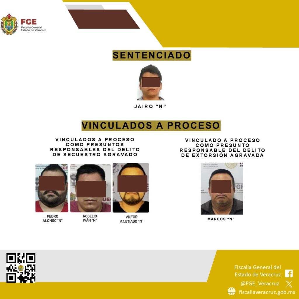 En cuanto a las vinculaciones a proceso, la primera se llevó a cabo en Xalapa en contra de Rogelio Iván “N”, Pedro Alonso “N” y Víctor Santiago “N” como presuntos responsables del delito de secuestro agravado. Los hechos se suscitaron el 24 de junio de 2024, cuando la víctima fue privada de su libertad sobre la calle Hermenegildo Galeana, en la ciudad de Martínez de la Torre.