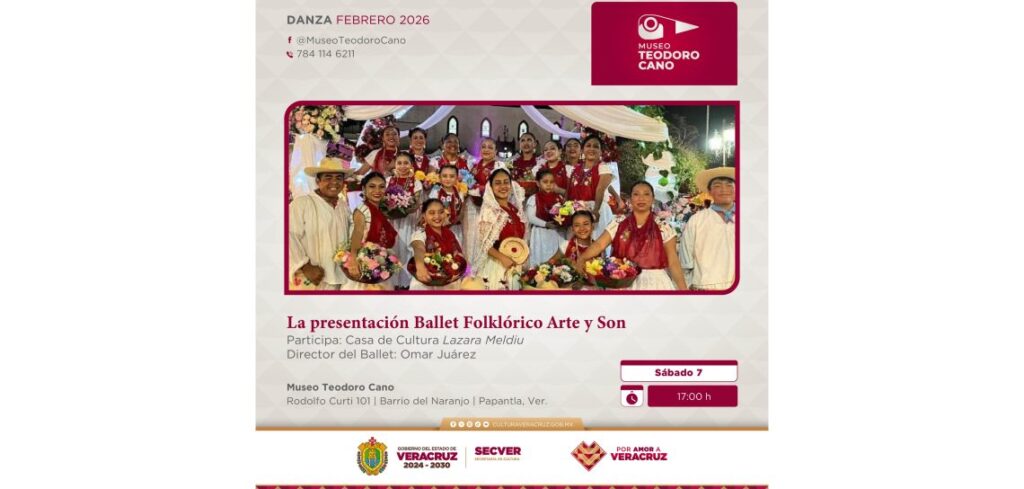 Xalapa, Ver., viernes 06 de febrero de 2026.- La Secretaría de Cultura de Veracruz (SECVER) invita al público en general a asistir a la exhibición de danza del Ballet Folklórico Arte y Son que se llevará a cabo el día sábado 07 de febrero, a las 17:00 horas, en el Museo Teodoro Cano, en Papantla. La entrada es libre.