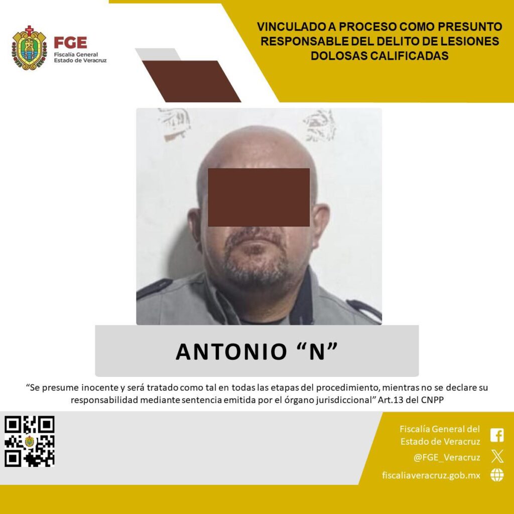 Xalapa, Veracruz.-La Fiscalía General del Estado informa que, a través de la Fiscalía Regional Veracruz, presentó ante el órgano jurisdiccional datos de prueba que permitieron la vinculación a proceso en contra de Antonio “N”, como presunto responsable del delito de lesiones dolosas calificadas.