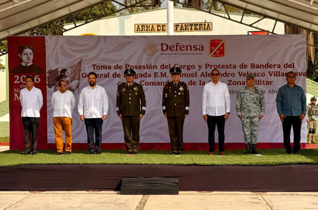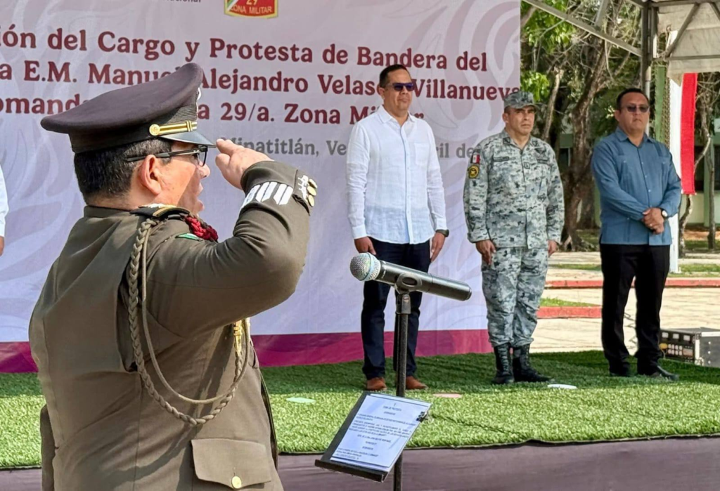 Durante este acto solemne, el General de Brigada de Estado Mayor Manuel Alejandro Velasco Villanueva rindió protesta como nuevo comandante de la 29/a Zona Militar, asumiendo la alta responsabilidad de encabezar las labores militares en esta importante región del sur de Veracruz.